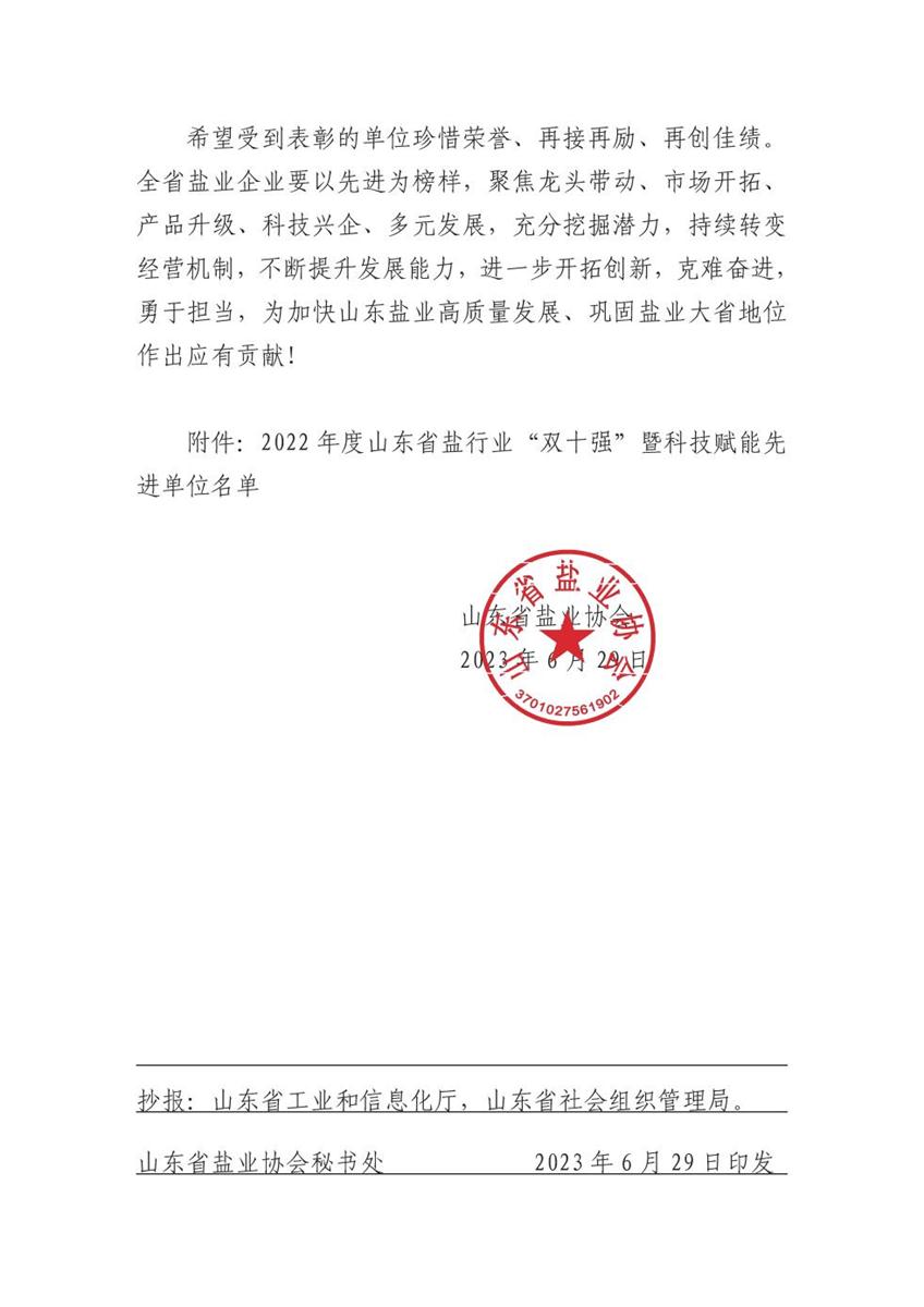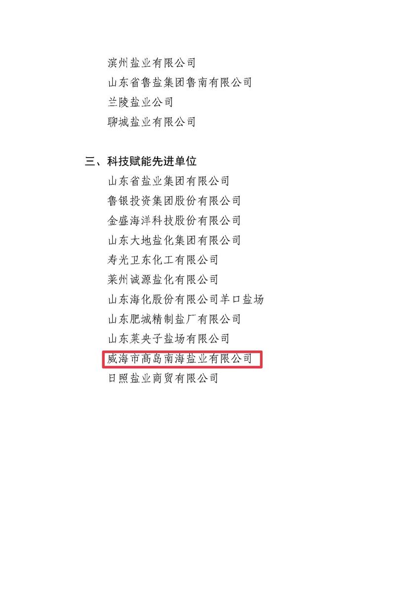 6月29日至30日,山东省盐业协会第四届会员大会暨四届一次理事会在济南召开。会上对2022年度盐行业“双十强”企业和科技赋能先进单位进行了表彰。威海市高岛南海盐业有限公司荣获山东省盐行业“科技赋能先进单位”称号。